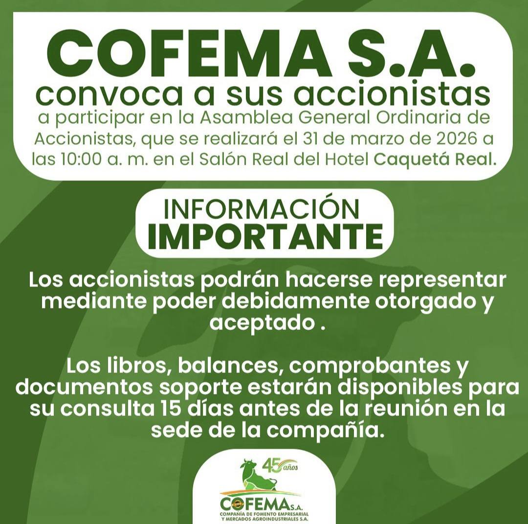 Diario del Caquetá, el periódico de los caqueteños La Compañía de Fomento Empresarial y Mercados Agroindustriales S.A. (COFEMA) convocó oficialmente a sus accionistas a participar en la Asamblea General Ordinaria,…
