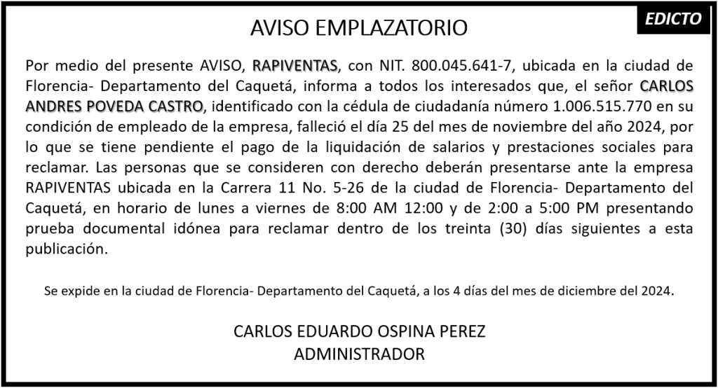 Se informa que, tras el fallecimiento del empleado Carlos Andrés Poveda Castro el 25 de noviembre de 2024, se encuentra pendiente el pago de liquidación de salarios y prestaciones sociales. Los interesados deben presentar su reclamación dentro de los 30 días siguientes en las oficinas de RAPIVENTAS, ubicadas en Florencia, Caquetá.