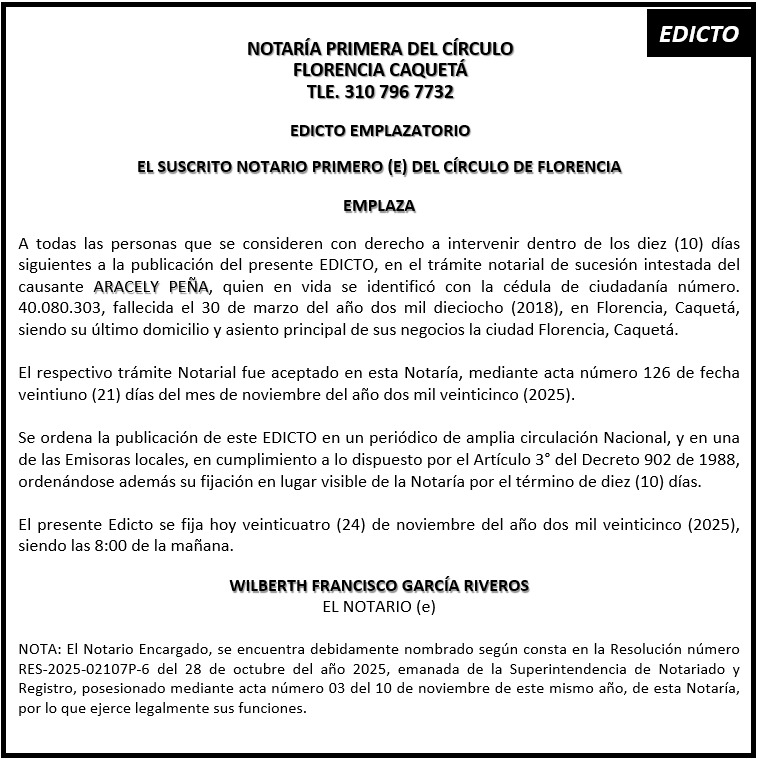Se emplaza a quienes se consideren con derecho a intervenir en la sucesión intestada de ARACELY PEÑA, c.c. 40.080.303, fallecida el 30 de marzo de 2018 en Florencia, Caquetá.