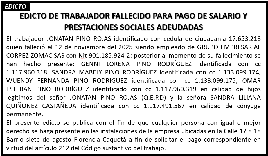 GRUPO EMPRESARIAL CORPEZ ZOMAC S.A.S. informa el fallecimiento del trabajador Jonatan Pino Rojas (Q. E. P. D.), ocurrido el 12 de noviembre de 2025. Se invita a las personas que se consideren con igual o mejor derecho a presentarse en la Calle 17 No. 8–18, barrio Siete de Agosto, Florencia – Caquetá, conforme al artículo 212 del Código Sustantivo del Trabajo.