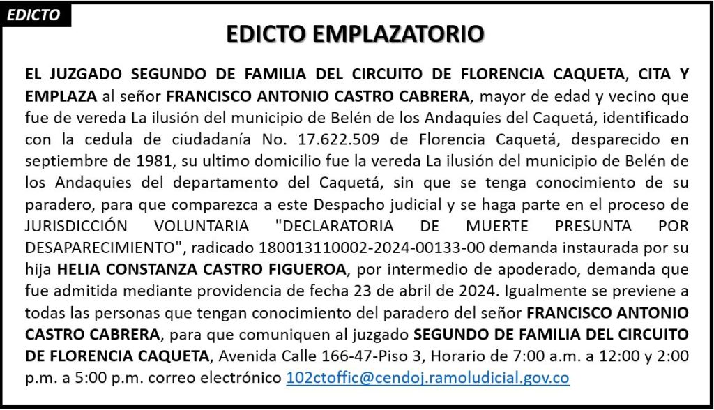 El Juzgado Segundo de Familia del Circuito de Florencia, Caquetá, cita y emplaza al señor FRANCISCO ANTONIO CASTRO CABRERA, identificado con cédula de ciudadanía No. 17.622.509 de Florencia, Caquetá, desaparecido desde septiembre de 1981, cuyo último domicilio fue la vereda La Ilusión, municipio de Belén de los Andaquíes.